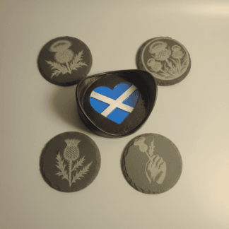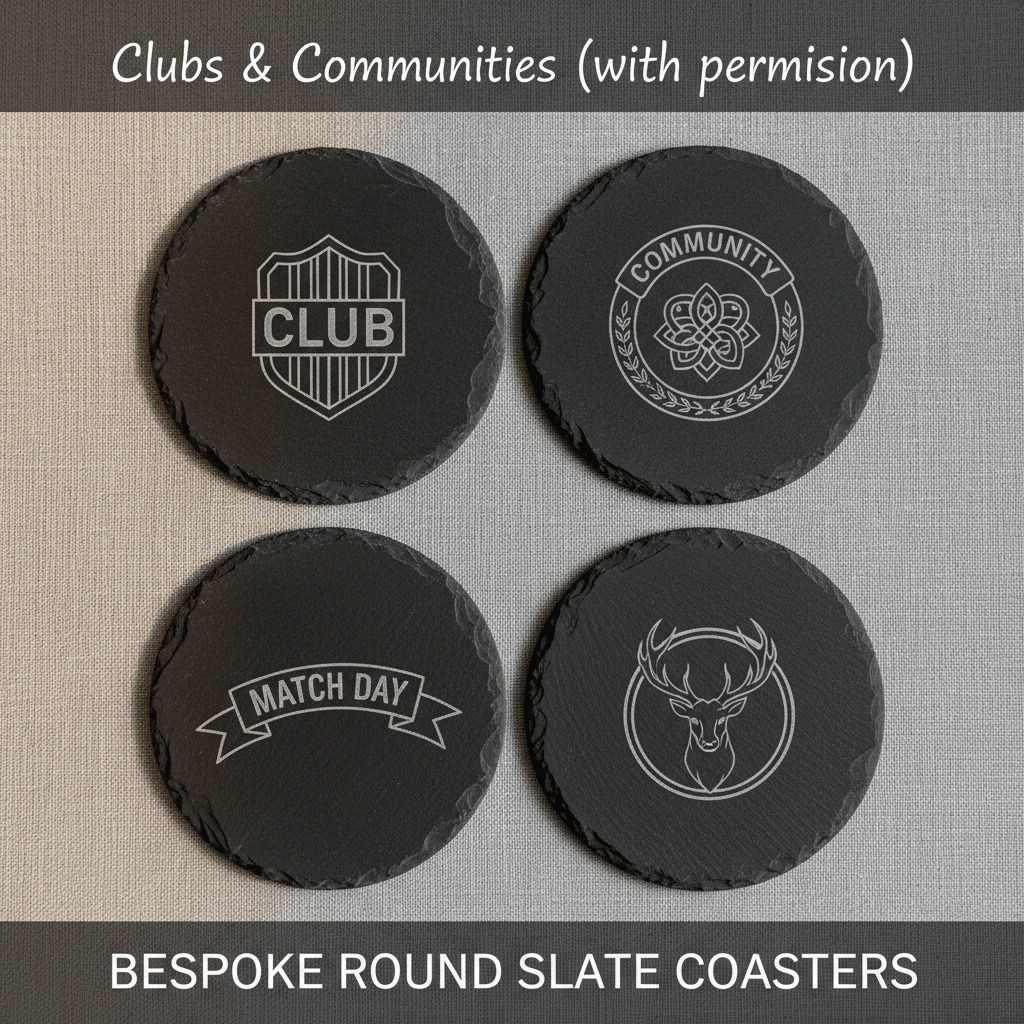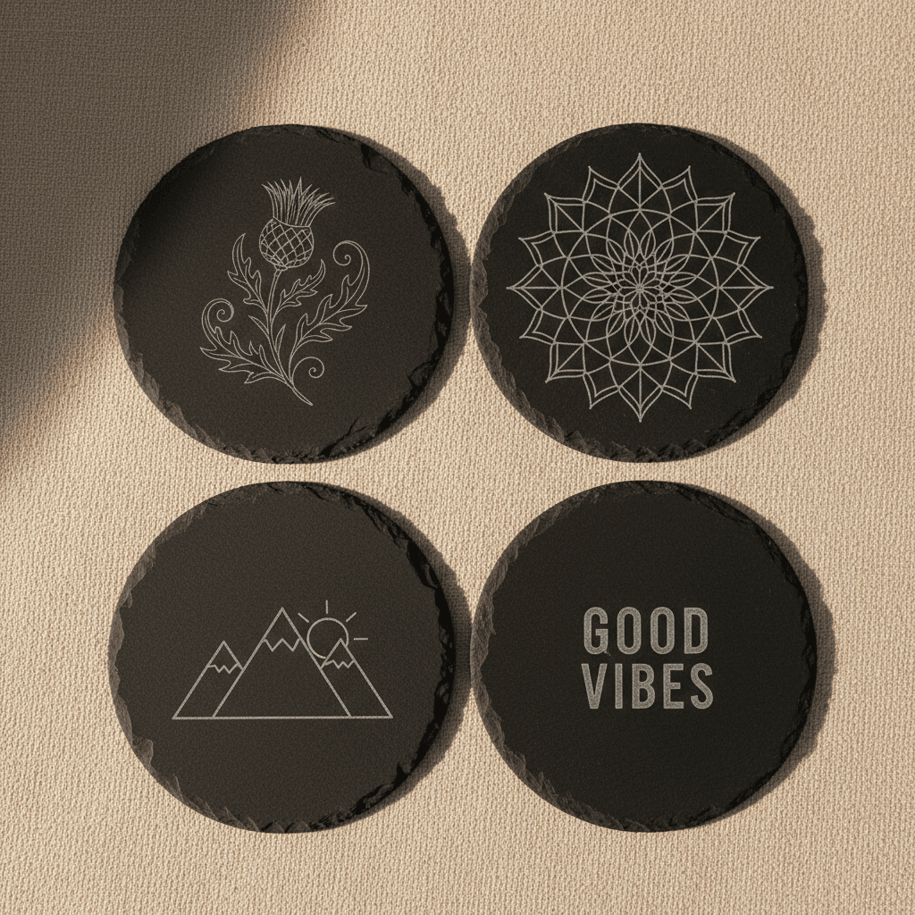 A unique gift idea: 4 round slate coasters in a 3D printed, hand painted holder, laser-engraved with your design. Handmade in the UK and made-to-order.