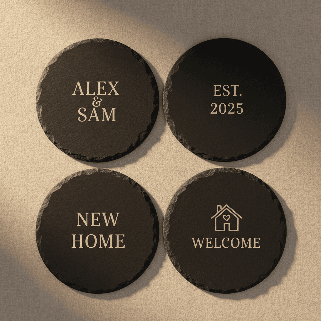 Names, dates, “first home” gifts, anniversaries, housewarming sets, inside jokes.