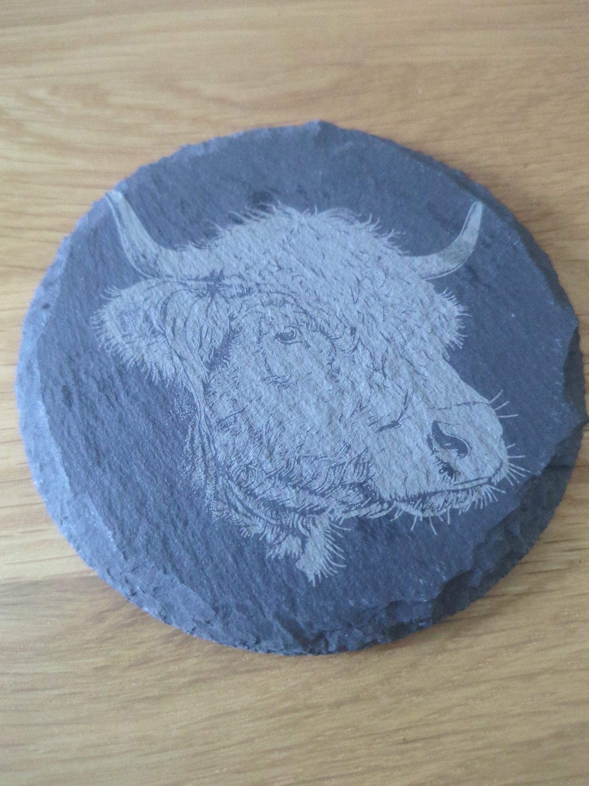 • Set of 4 natural slate coasters with laser-engraved Highland cow designs