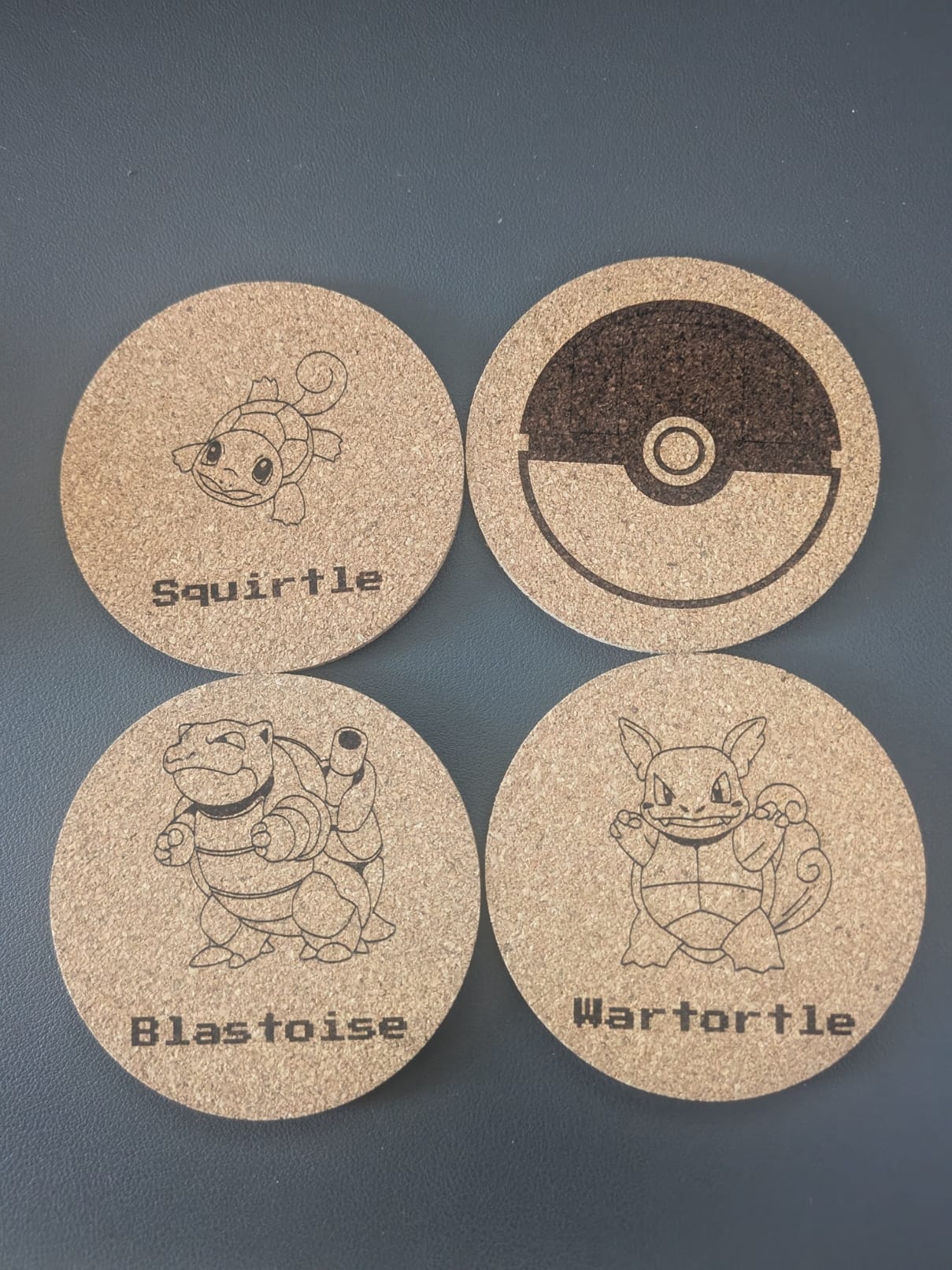 Set Contents: 4 individually laser-engraved cork coasters featuring the complete Squirtle evolution line plus iconic Pokeball design.